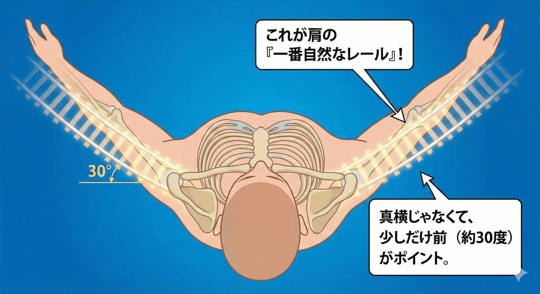 この肩甲骨の向きに合わせて「斜め前(約30度)」