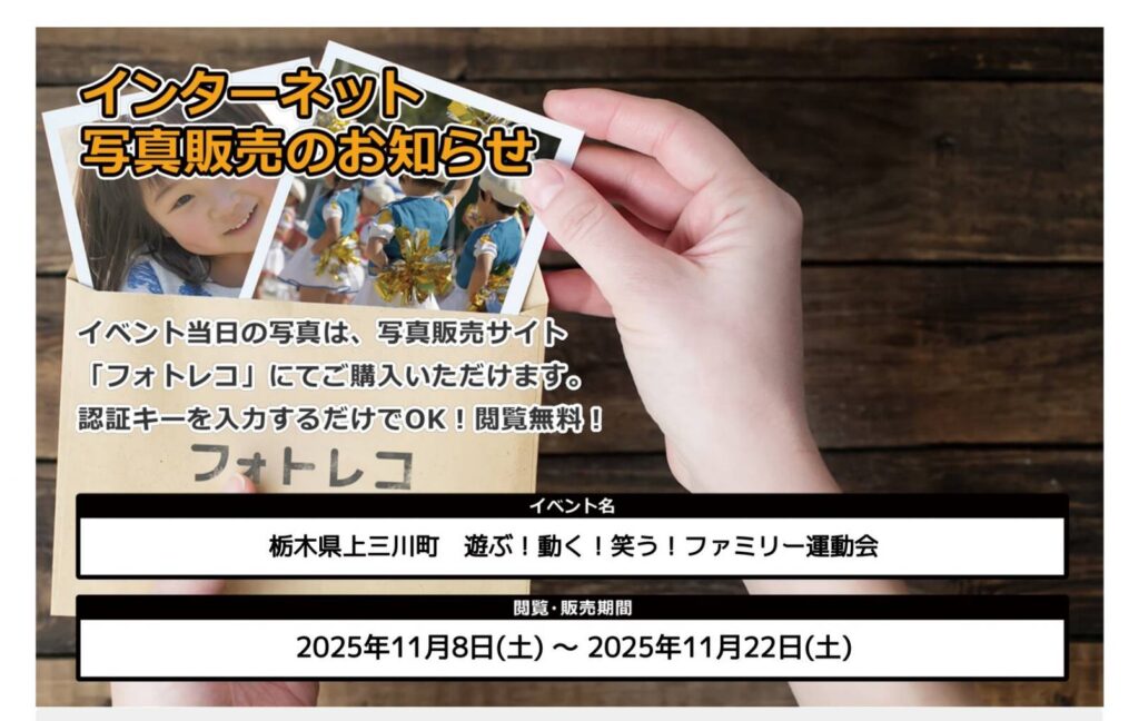 NEWS ニュース TOP NEWS ファミリー運動会 写真販売会のお知らせ! NEWS 2025/11/02 ファミリー運動会 写真販売会のお知らせ! 11/8(日)10:00~12:30 ファミリー運動会(in 日産体育館様) みなさまの笑顔と感動の瞬間を、 プロカメラマンが撮影します! 当日撮影した写真は、 後日オンライン販売サイトにて閲覧・購入が可能です。 ◎閲覧・販売期間 2025年11月9日(日)~2025年11月22日(土) ◎価格 300円/枚 ◎お支払方法 コンビニ決済 クレジットカード PayPay back to allnext RELATED ARTICLES NEWS 2025/11/02 ファミリー運動会 写真販売会のお知らせ! NEWS 2025/11/01 ファミリー運動会まで残り1週間! NEWS 2025/07/13 ファミリー運動会Q&A NEWS 2025/07/03 11/8(土)ファミリー運動会参加に伴う同意 NEWS 2025/06/22 ファミリー運動会開催! NEWS 2025/02/20 【重要】キャンセル料及び出張費に関するお知らせ NEWS 2024/11/05 今週のご予約状況 NEWS 2024/10/11 営業電話お断り NEWS 2024/09/13 9月28日いきいきナイトに出店! NEWS 2024/08/10 サンフラワー祭り出店!